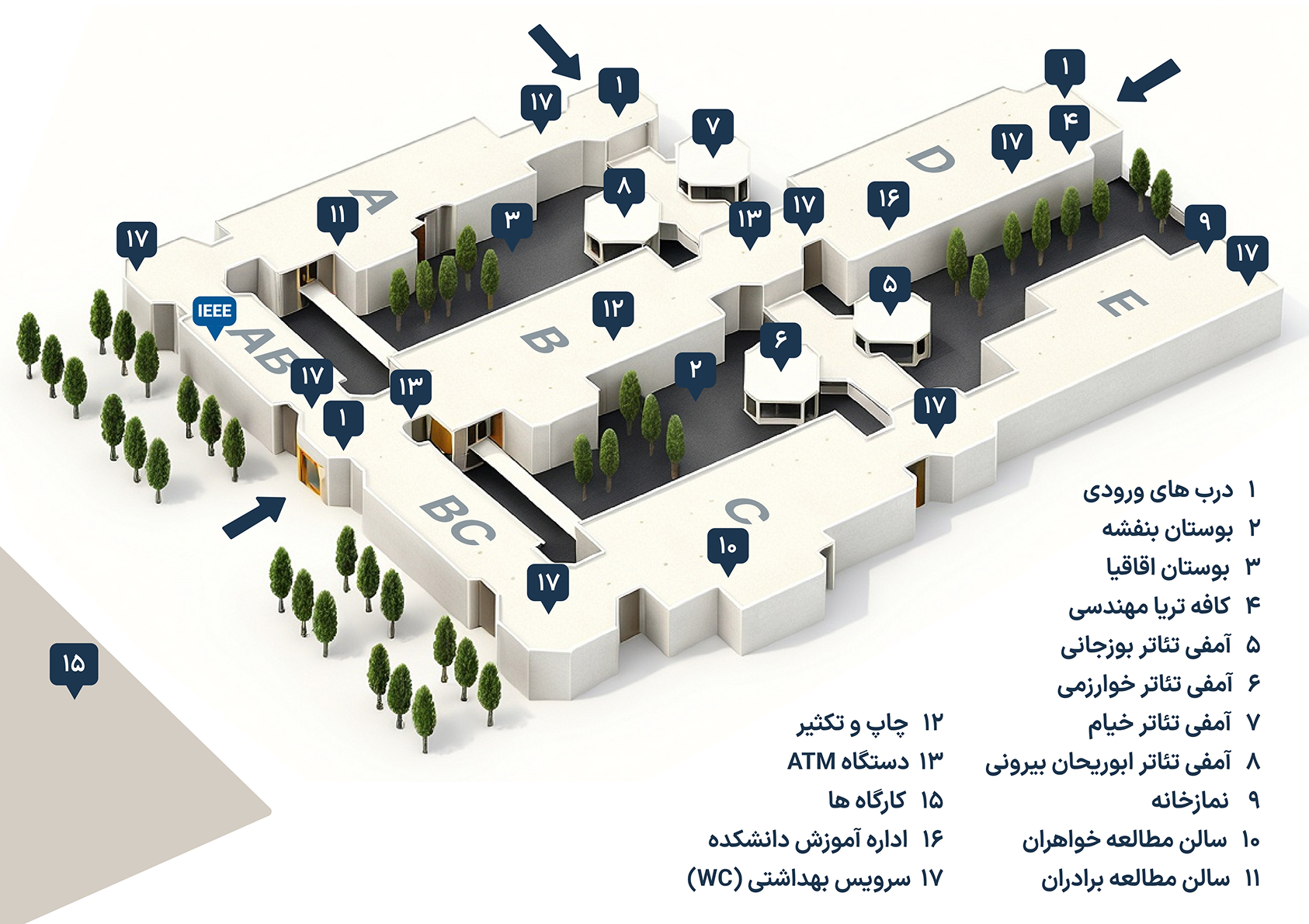 در نقشه تعاملی زیر میتوانید موقعیت دانشکده مهندسی و بخشهای مهم دانشگاه فردوسی مشهد را مشاهده کنید.